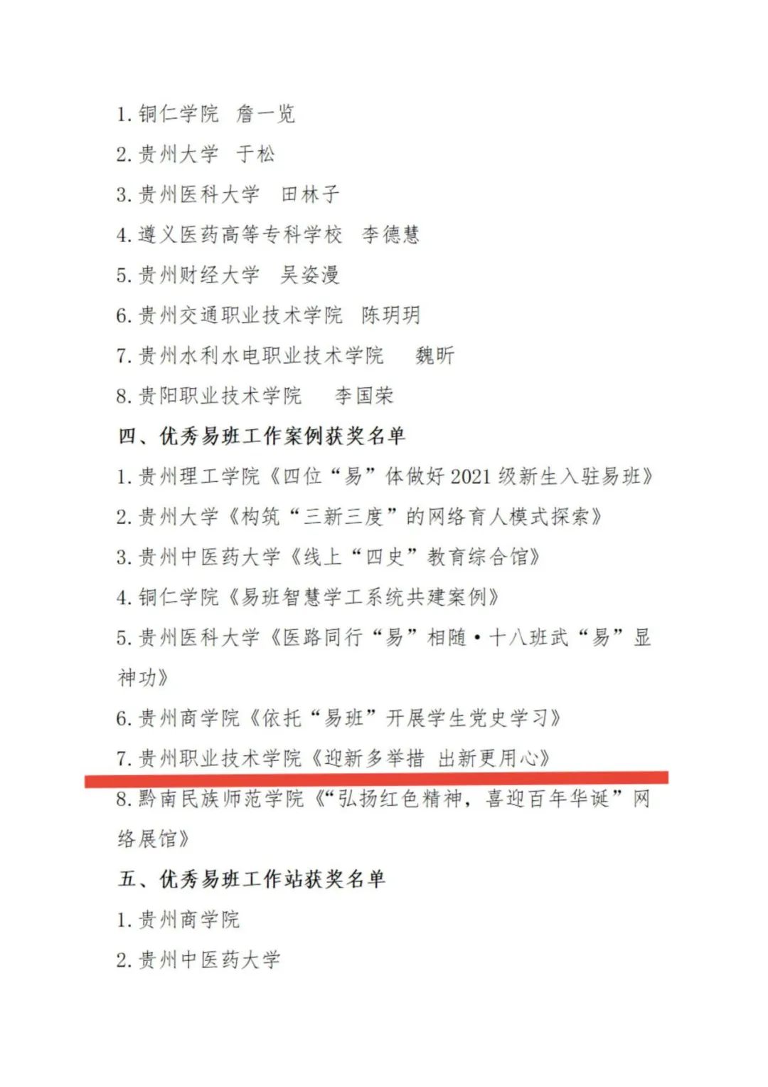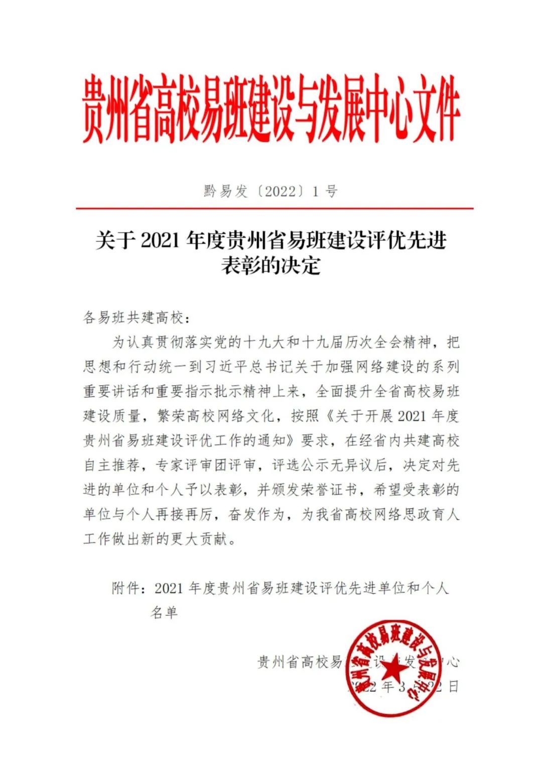 为认真贯彻落实党的十九大和十九届历次全会精神,把思想和行动统一到习近平总书记关于加强网络建设的系列重要讲话和重要指示批示精神上来,全面提升全省高校易班建设质量,繁荣高校网络文化,按照《关于开展2021年度贵州省易班建设评优工作的通知》要求,经自主推荐,专家评审团评审,评选公示无异议后,贵州省易班发展与建设中心决定对推选出的先进单位和个人予以表彰,我校被评为2021年全省优秀易班共建高校,迎新工作案例获全省优秀易班工作案例。