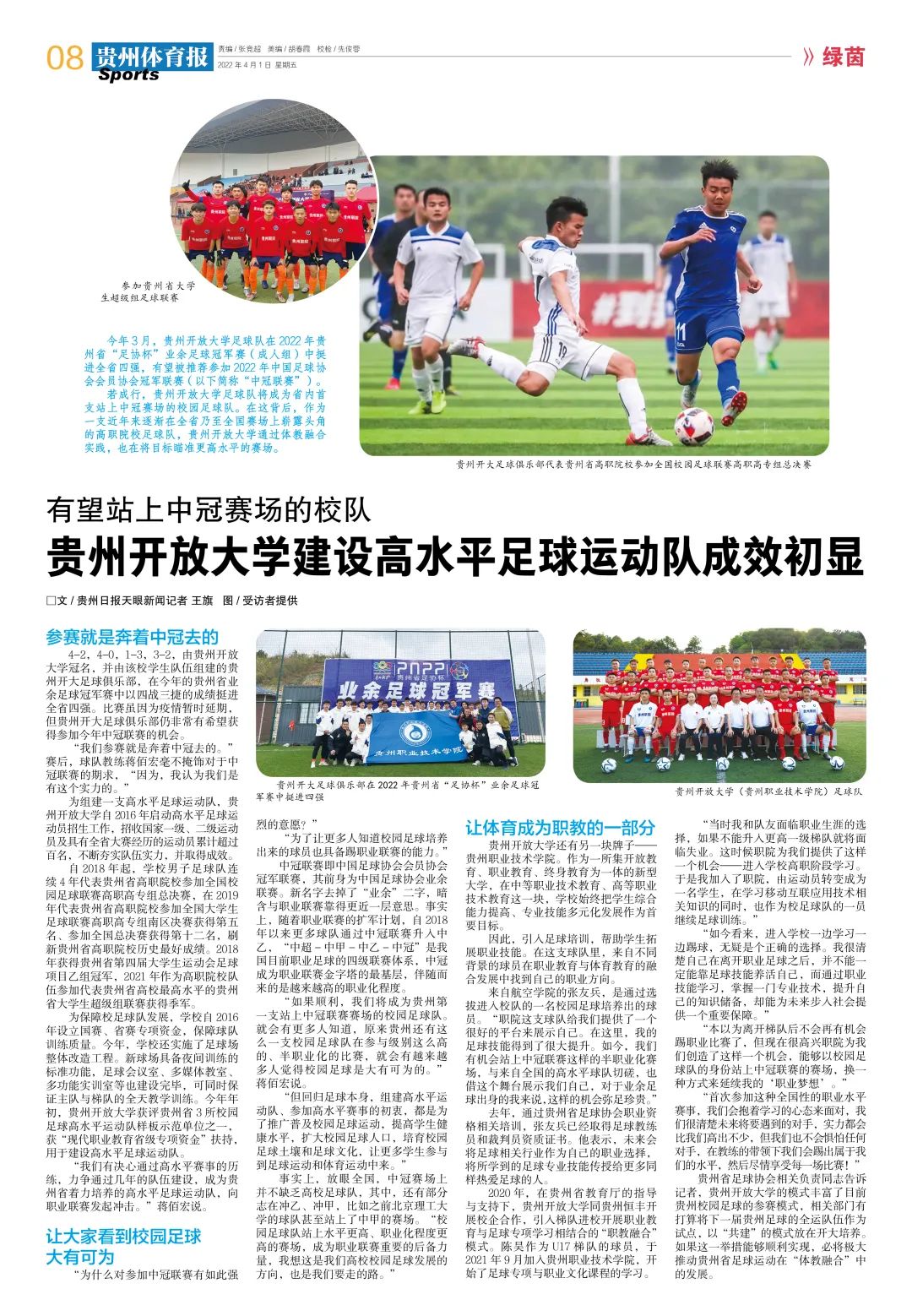 4月1日,贵州省体育报对我校高水平足球运动队建设系列工作进行了整幅刊面的专题报道。这是继2020年我校足球项目开展成果工作获“贵州教育发布”官微点赞之后,第二次被省内官媒认可并作专题报道。