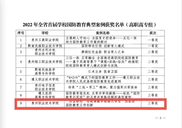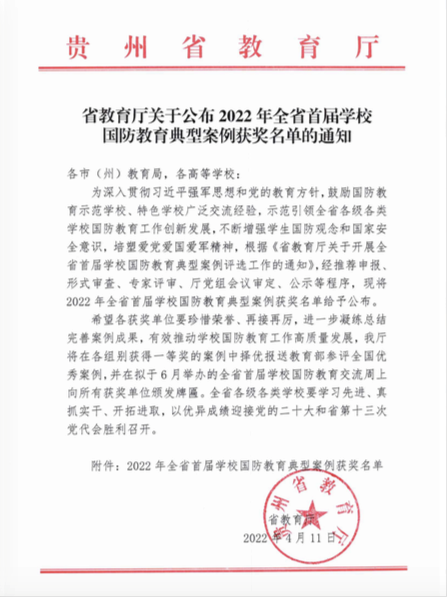 由贵州省教育厅主办的2022年全省首届学校国防教育典型案例评选活动结果揭晓,我校参赛案例作品《“四堂联动”思政课教学助推大学生“预征班”国防教育工作创新》获得高职组三等奖。