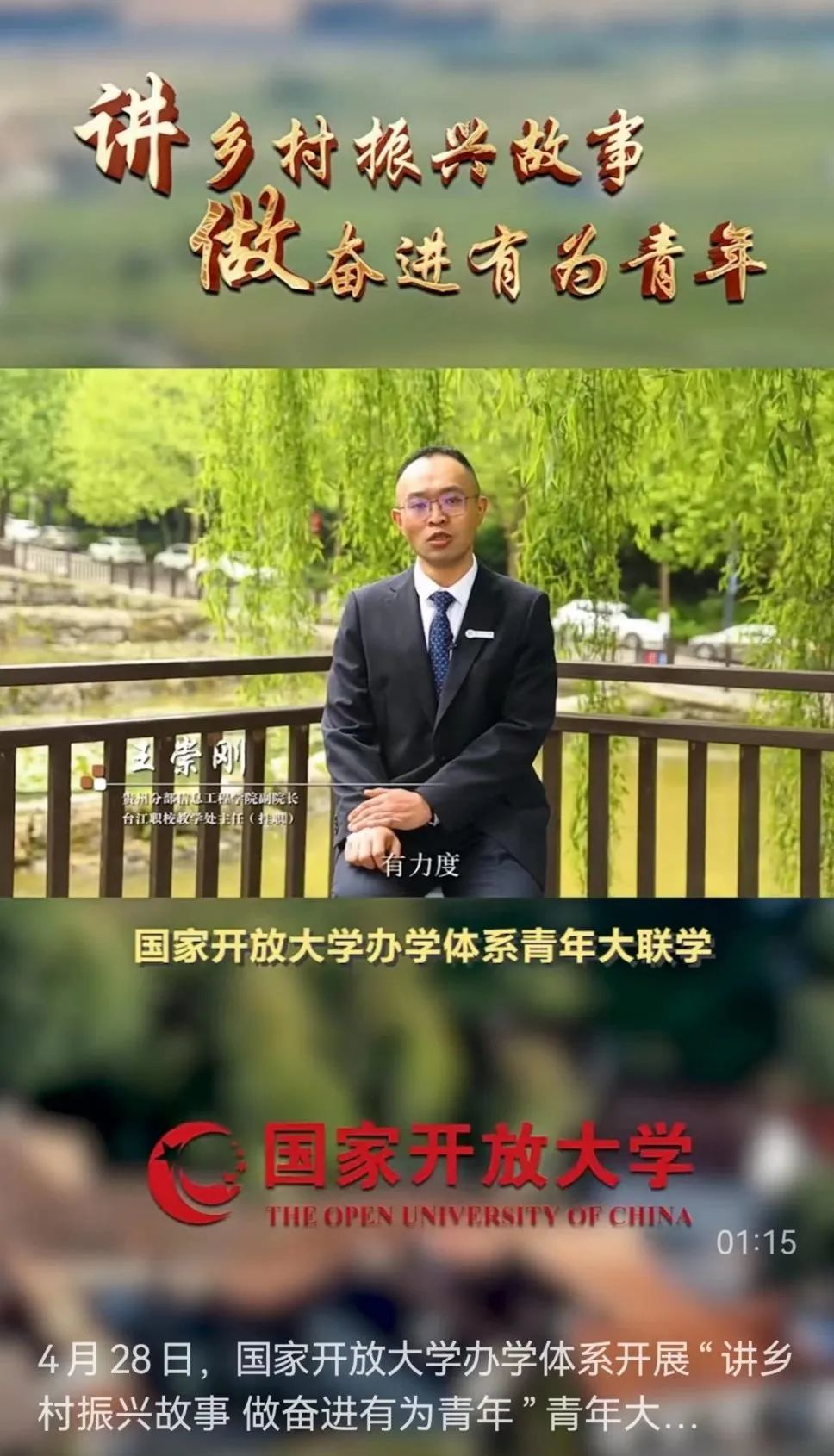 4月28日,国家开放大学举办“讲乡村振兴故事 做奋进有为青年”办学体系青年大联学,国开总部和河南分部、海南分部、四川分部、贵州分部、甘肃分部、新疆分部结合自身办学特色和乡村振兴实践,共同策划制作了《以青春之姿 担国家之使命》专题片,我校信息工程学院王崇刚老师分享了自己的乡村振兴故事。