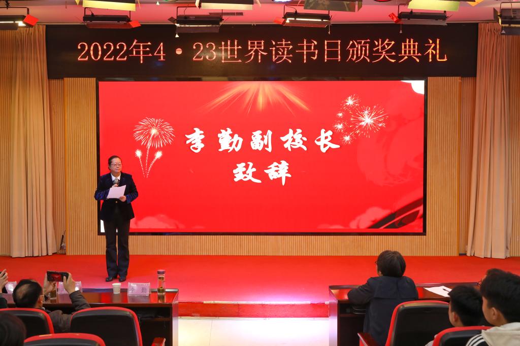 副校长李勤为颁奖仪式致辞。她鼓励师生尊重知识、崇尚阅读,并邀请获得本年度的“阅读之星”代表上台发言。信息工程学院党总支书记姚楠作为教师组代表上台发言。他从阅读时的困惑道出阅读对人生的重要性,浅谈读书时的心得体会。艺术与设计学院潘航航同学代表学生组上台作获奖感言,分享了阅读《风沙星辰》的读书感想,鼓励大家一起学习,共同进步。