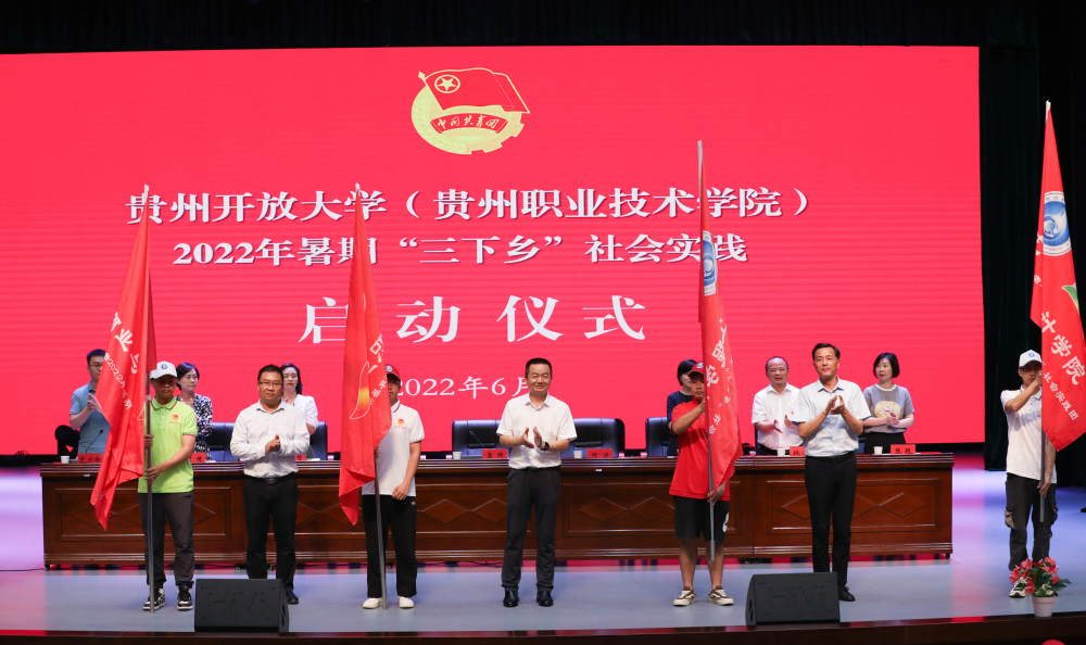 6月23日,贵州开放大学(贵州职业技术学院)大学生志愿者2022年暑期“三下乡”社会实践启动仪式在大礼堂举行。学校党委副书记龚辉出席启动仪式,党委宣传部、党委学工部、各学院党总支书记(院长)、校团委全体工作人员、各学院团总支书记,各实践团队指导老师、实践队员参加启动仪式。