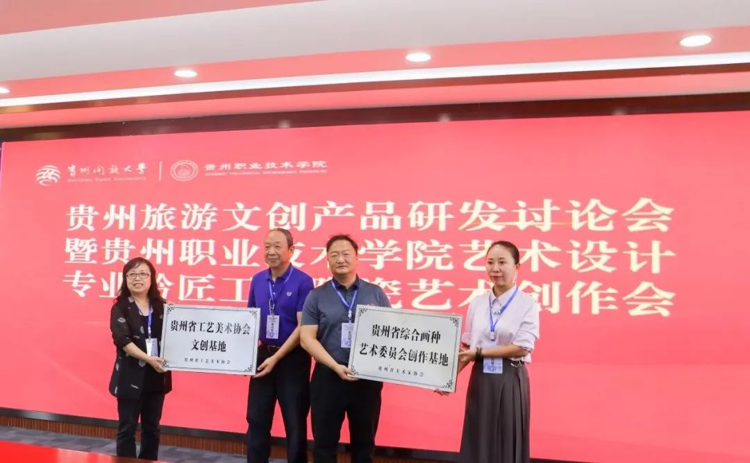 会议最后,在与会人员的共同见证下,贵州省美术家协会、贵州省工艺美术协会与艺术与设计学院共建基地挂牌。