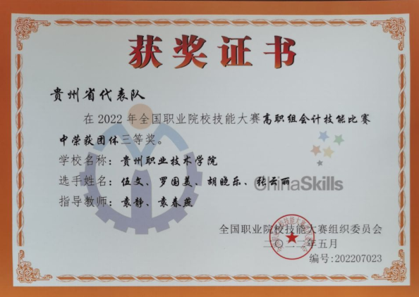 2022年8月21日-23日,全国职业院校技能大赛高职组会计技能赛项在四川财经职业学院顺利举办。大赛由教育部、四川省人民政府、国家发展和改革委等三十六部门联合主办,四川省教育厅、四川省财政厅、成都市人民政府共同承办,四川财经职业学院协办。来自全国各省、自治区、直辖市的63支代表队252名选手参加比赛。我校商贸学院大数据与会计专业袁静和袁春燕老师指导的伍文、罗国美、胡晓乐、张云丽代表队经过三个赛段的激烈角逐,荣获“会计技能”赛项(高职组)国家级三等奖。