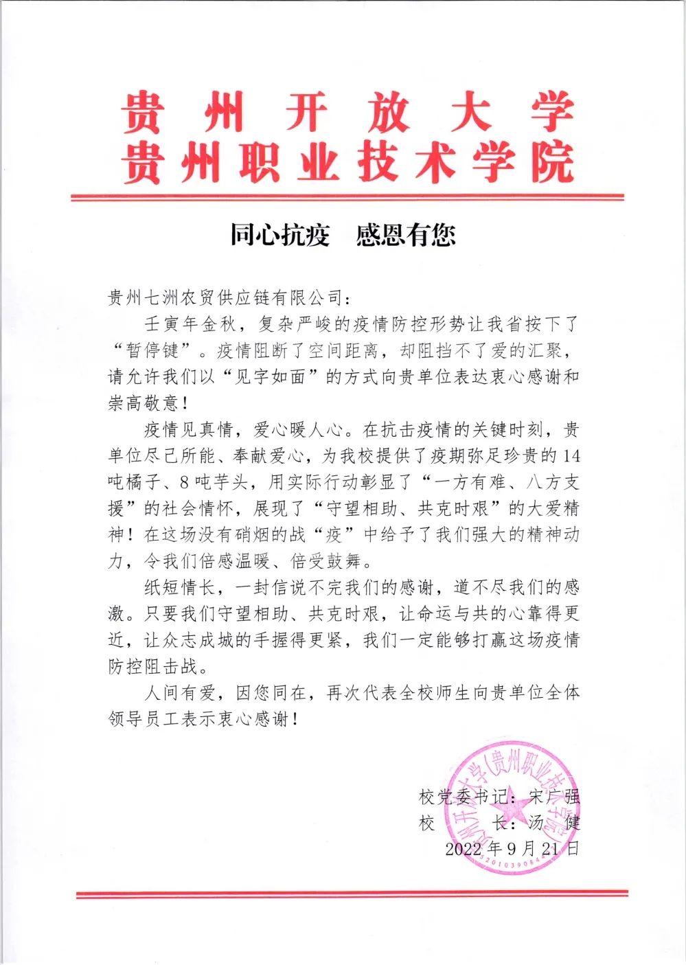 壬寅年金秋,复杂严峻的疫情防控形势让我省按下了“暂停键”。疫情阻断了空间距离,却阻挡不了爱的汇聚,请允许我们以“见字如面”的方式向贵单位表达衷心感谢和崇高敬意!