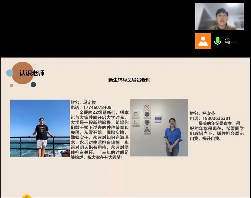 “青春真好,青春孕育无限希望”。迎新班会上,同学们云端相见,游览校园、找到了如家的归属感;认识老师、感受到了亲友般的亲切感。他们了解了大学生活,满怀期待随时整装待发;了解了规章制度,跃跃欲试要做好大学生涯规划。新生辅导员老师告诉同学们:这里有我,即将陪伴你们三年,我会用心守护你们的成长;这里有你,在青春的赛道上奋勇争先,成为校园最靓丽的一道风景;这里有我们,一起向未来,成就双向奔赴的师生情。