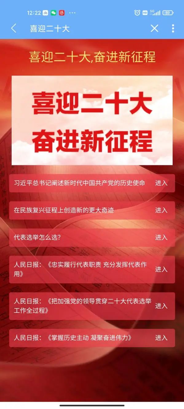 为迎接党的二十大胜利召开,10月14日,由学工部、信息工程学院联合制作的“喜迎二十大”线上学习展馆在易班平台上开通。展馆共分为六个板块,展现了近5年来党和国家事业的重大成就,中国共产党人精神谱系,党的二十大代表风采事迹,“喜迎二十大”知识竞答,遵义会议、四渡赤水等线上纪念馆以及学校学习宣传贯彻党的二十大精神的情况。