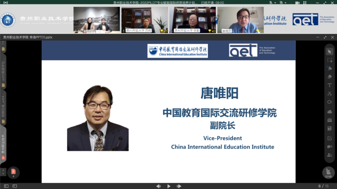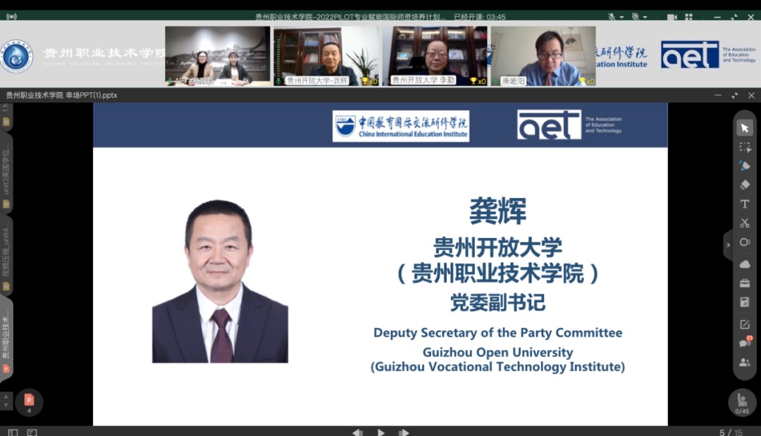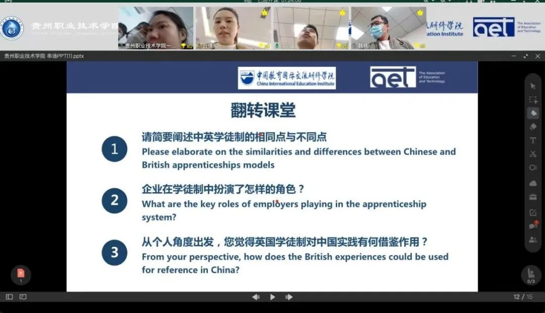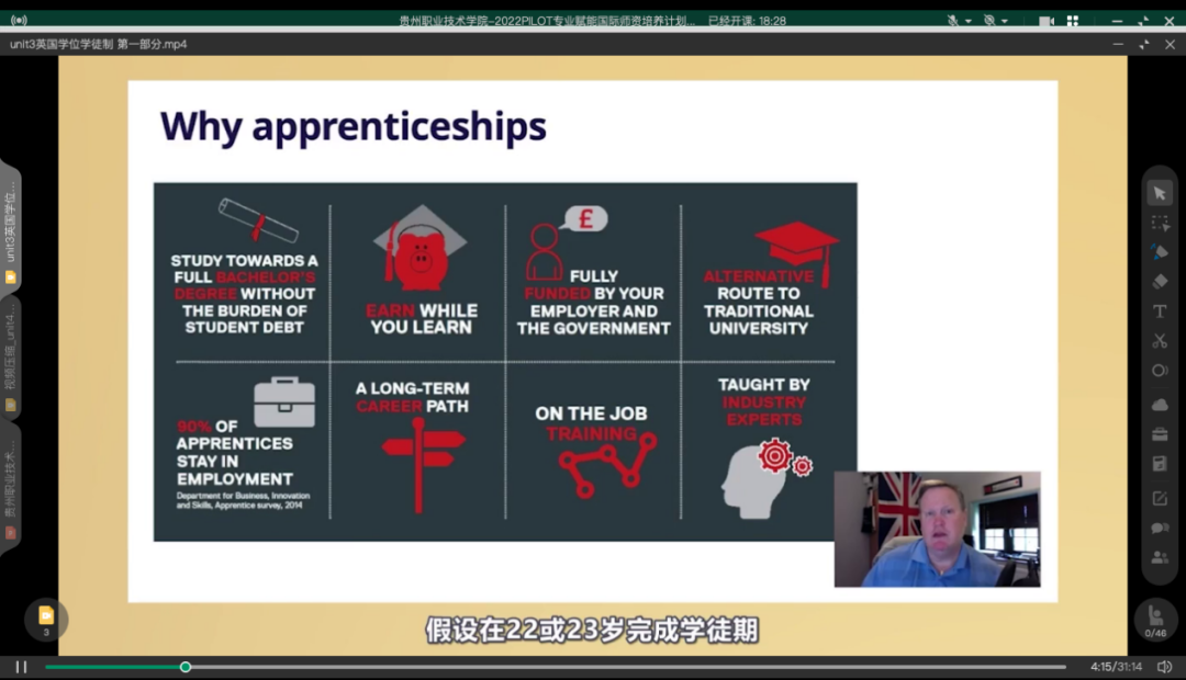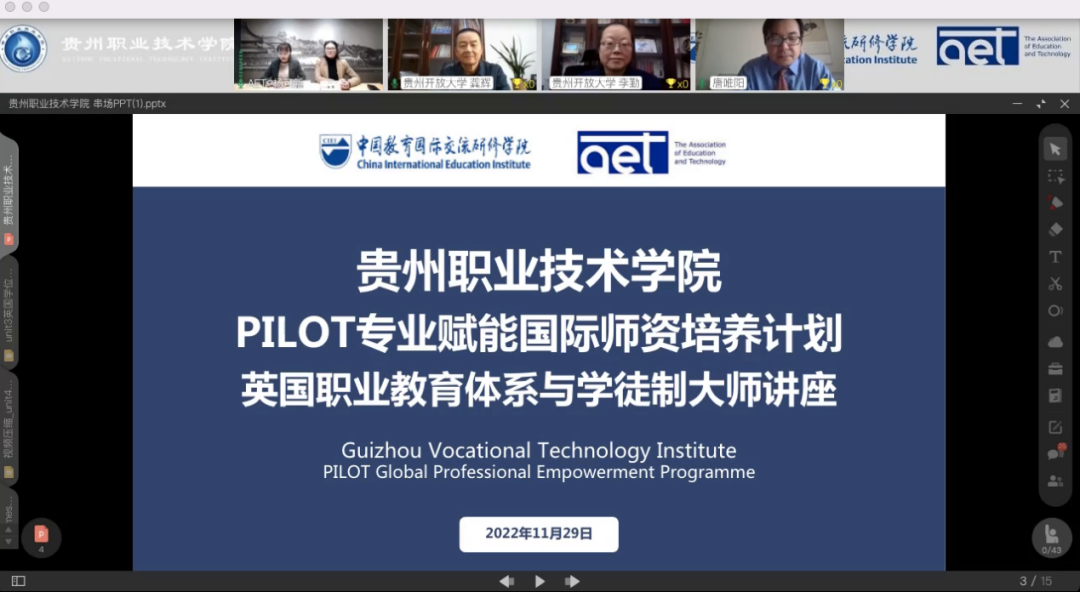 为加强学校的双高专业群建设、师资团队建设,培养复合型国际化高素质技术技能人才,贵州职业技术学院于11月29日成功举办了由中国教育国际交流研修学院及英国教育科技协会联合打造的“PILOT专业赋能国际师资培养计划”之英国职业教育体系与学徒制大师讲座。