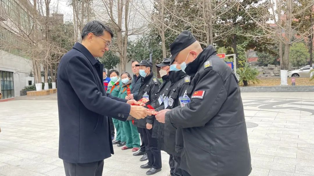 虎振雄风留浩气,兔迎盛世启新程。寅虎除夕,学校党委书记宋广强率领相关部门慰问看望坚守岗位的两校区保安、物业、宿管、保洁等基层一线人员,详细了解他们的生活、工作等情况,对大家以校为家不言苦、坚守岗位不言累的爱岗敬业精神表示感谢。