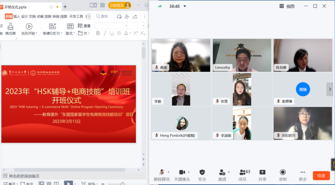 为进一步增强我校与东盟国家的交流合作,促进“中文+职业”教育,助力“一带一路”发展,推动教育部援外项目--东盟国家留学生电商物流技能提升培训及东盟留学生创业示范工程项目落实落地,我校依托现代商务东盟职教指导中心,为50名柬埔寨学生定制了为期三个月的“HSK辅导+电商技能”线上培训。2023年3月13日晚7点,中柬双方师生相会云端,举行了线上开班仪式。党委委员、副校长李勤出席了开班仪式。