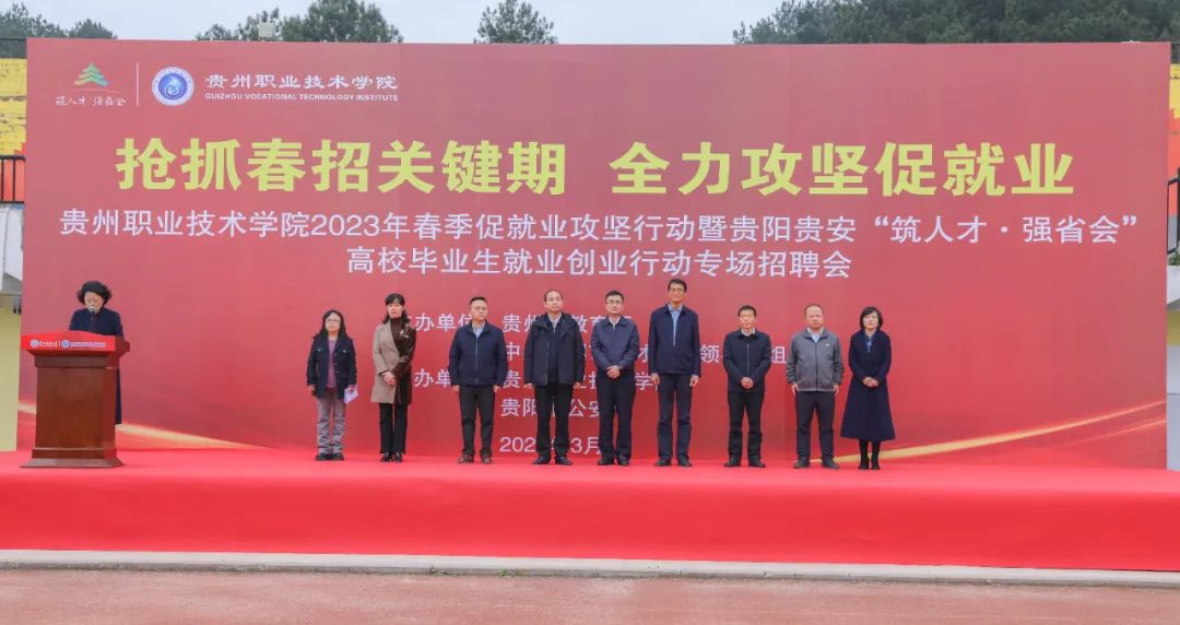 3月30日,由贵州省教育厅、中共贵阳市人才工作领导小组共同主办的贵州职业技术学院2023年春季促就业攻坚行动暨贵阳贵安“筑人才.强省会”高校毕业生就业创业行动专场招聘会在云潭南路校区足球场举行。党委书记宋广强,党委副书记、校长汤健,贵阳市人民政府副市长、市公安局党委书记、局长陈刚,贵阳市公安局党委委员、政治部主任吴小强出席招聘会启动仪式。党委委员、副校长于立群主持活动。