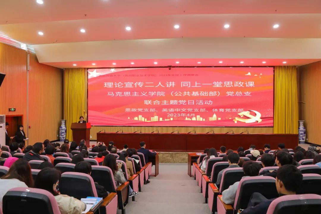 4月7日上午,马克思主义学院党总支“理论宣传二人讲 同上一堂思政课”联合主题党日活动在行政楼九楼举行。学校党委书记宋广强,党委委员,党委组织部部长张仁俊,学校各党总支党员代表、马克思主义学院(公共基础部)党总支全体党员、统战教师代表和学生代表参加了此次活动。活动由马克思主义学院党总支副书记、院长程守艳主持。