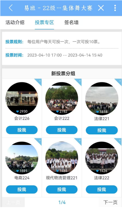 班级风采展示——凝聚青春力量,激发奋进之志。在大赛开始前两周,为更好地营造大赛氛围、加强班级动员,2022级各班将班级创意合影、班级口号投放在易班“集体舞大赛”班级投票窗口,向全校展示班级风采,带动班级投票。最终会计226班以2930票获得“奋进商贸·时代之星班集体”称号。