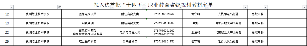 7月10日,贵州省教育厅发布《关于拟入选首批“十四五”职业教育省级规划教材和立项建设教材名单的公示》,我校《职业基本素养》《信息技术基础》《纳税实训》《直播电商实战》4本教材入选贵州省首批“十四五”职业教育省级规划教材,《ERP沙盘实训》1本教材获省级规划立项建设,实现了我校在省级规划教材建设上新的突破!