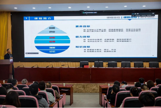 讲座中,王锦荣以《高等数学教学案例设计与实践育人(以定积分概念为例)》为题进行了专题报告。首先,他讲到国家对数学学科十分重视,在日常生活中应用也非常广泛,因课程属性特征,想要激发起学生的学习兴趣,在教学上就要分析痛点、创新教学理念、更新教学方式、重构教学内容,既要让学生容易接受又要能融入思政元素,实现课堂育人功能。其次,他以定积分概念为例,借助贵州常见的景观—梯田,设计教学案例,向在座师生展示了“一核五环六库”教学模式。最后,他鼓励教师们时刻关注研究前沿,寻找热点研究方向;开展本质原创性工作,力争发表高水平论文;在自己研究的领域不断地努力探索的同时,不要忘记做好教书育人的本职工作,为党育人,为国育才。并且鼓励教师们要提升核心素养,增强思维能力,培养创新意识,厚植家国情怀,勇担时代使命。