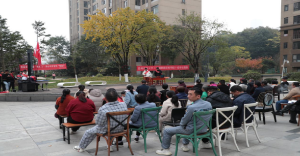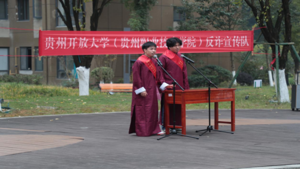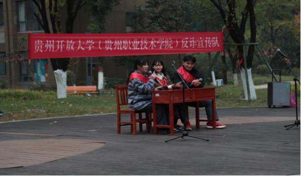 2023年11月23日下午,贵州开放大学(贵州职业技术学院)反诈宣传队再次应邀前往观山湖区金华园街道铭廷社区书香苑小区开展防范电信网络诈骗宣传演出活动。金华园街道、金华园派出所、铭廷社区、书香苑物业公司工作人员和广大居民参加活动,金华园街道党工委副书记、政法委员喻元平参加活动并讲话。学校党委保卫工作部带队并组织活动。