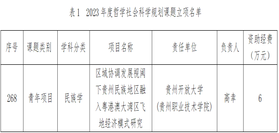 11月25日,贵州省哲学社会科学规划工作办公室发布2023年度哲学社会科学规划课题立项名单。我校教师高幸获批青年项目立项。在本次立项中,我校是唯一一所获得资金资助的高职院校,也是继2018年获得立项后,再次获批贵州省哲社课题立项。
