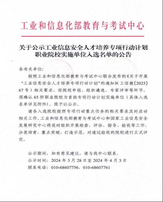 为优化工业信息安全产业人才发展生态,系统推进工业信息安全产业人才培养与评价工作,由工业和信息化部教育与考试中心联合国家工业信息安全发展研究中心共同发起“工业信息安全人才培养专项行动计划”2024年首次面向全国本科高校和高职院校开展遴选,由信息工程学院组成的申报团队,顺利通过了材料上报、组织遴选、专家评审等环节。近日,工信部网站公示,我校成功入选为首批专项行动计划实施单位。