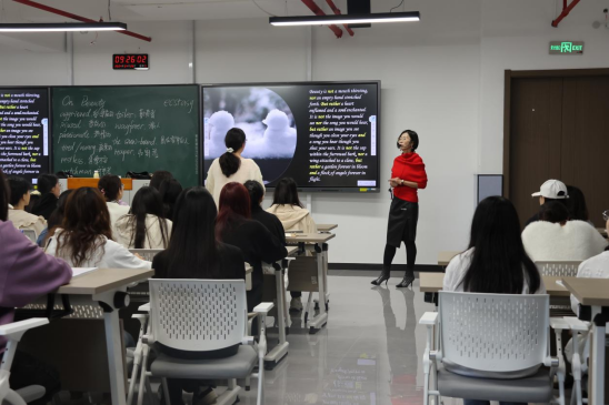 本次公开观摩的课程为《英语现场导游》,由旅游管理专业教师郭思妤主讲。郭思妤老师以英文阅读篇目《on beauty》为授课主线,带领学生对英文诗句进行分组诵读并逐句赏析,其中穿插英标学习、四六级词汇等知识点,引导学生跟着学、开口说、联想记,整个课堂氛围热烈,达到了较好的教学效果。