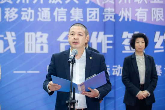 随后,中国移动通信集团贵州有限公司贵阳分公司总经理王良勇代表企业方讲话。他表示,贵州开放大学(贵州职业技术学院)紧紧围绕“德技并修 开放融合”的理念,为社会发展输送了大量的技能人才,教学质量和口碑也得到了贵州省各级领导、行业、社会各界的高度赞誉。双方将本着“互惠互利、优势互补、共同发展”的原则,充分发挥各自的资源优势和技术力量,促进学校学科发展和成果转化,提升贵阳移动在新一代信息技术领域的自主创新能力和核心竞争力,实现双方的共同发展。