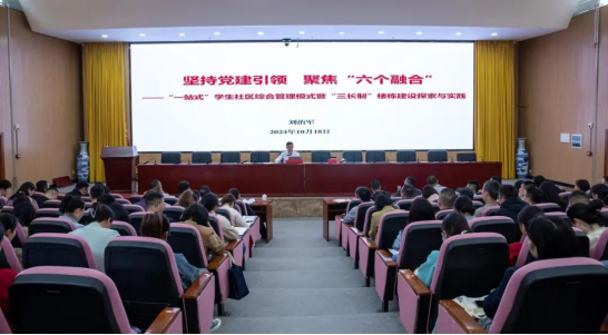 刘治军从“一站式”学生社区建设的政策背景与时代价值;省外高校“一站式”学生社区经验及做法;全力推进落实“三长制”楼栋建设;“三长制”楼栋建设成效;丰富“三长制”楼栋建设内涵等方面,阐释了“一站式”学生社区为什么要建和怎样建的问题。