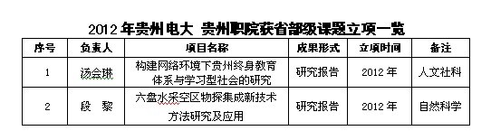 2011年,科研处组织了贵州省高层次人才条件特助项目,贵州省科技厅2012年度科学技术基金项目的申报,经专家评审,我校(院)两项申报课题分别获贵州省委组织部,省科技厅批准立项。