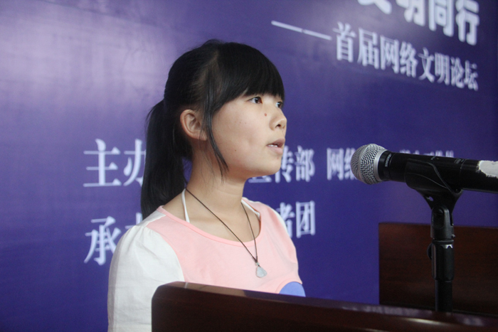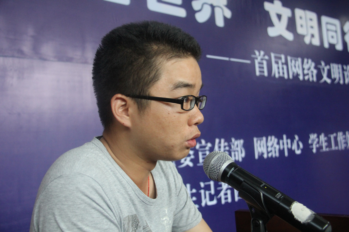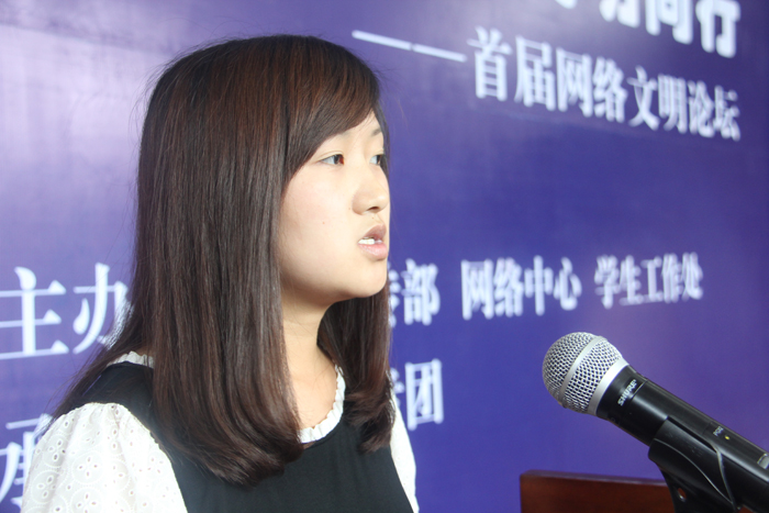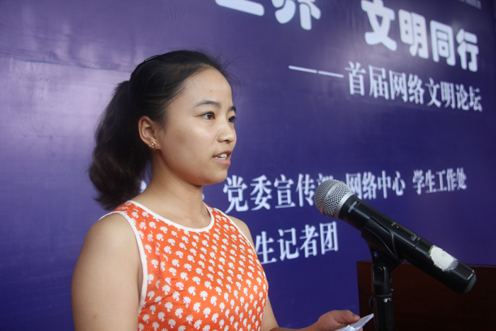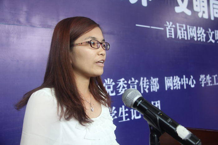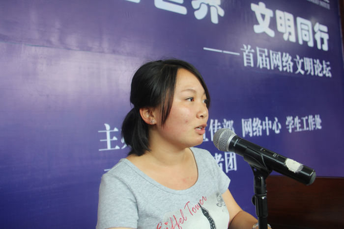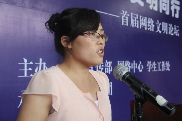 网络中心岳忠义老师,艺术系何洁老师,经管系麦莉莉老师,信息系张叶虹同学,能源系许羽老师,工程系金维老师,商贸系李俊同学,中职校胡左莲老师分别围绕“网络世界,文明同行”这一主题进行了精彩的发言。他们的发言既有理论深度,又切实符合师生学习、工作、生活实际,得到了现场师生的一致认可。