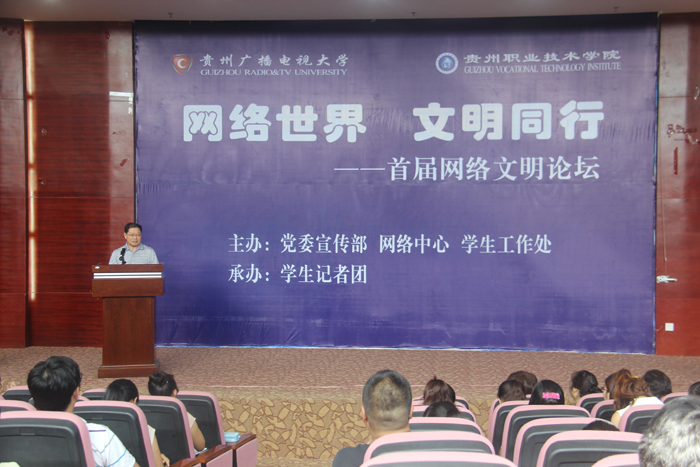 2013年7月2日下午,由党委宣传部、网络中心、学生工作处联合主办,学生记者团承办的贵州广播电视大学、贵州职业技术学院“网络世界,文明同行”首届网络文明论坛在行政楼九楼学术报告厅隆重举行。党委副书记江龙华出席论坛,党委宣传部统战部部长张仁俊,网络中心主任王文宣,学生工作处处长于立群,商贸系党总支书记刘德刚,工程系党总支书记周吉萍,信息系党总支书记梁正善,中等职业学校校长陈静淳,艺术系党总支副书记卿云,能源系党总支副书记侯晓玲,经管系党总支副书记孙燕,特邀点评嘉宾信息系副主任王道乾教授,网络中心网络科科长岳忠义以及全体辅导员、各系(校)学生代表、学生记者团全体成员150余人参加了论坛。论坛由学生工作处处长于立群主持。