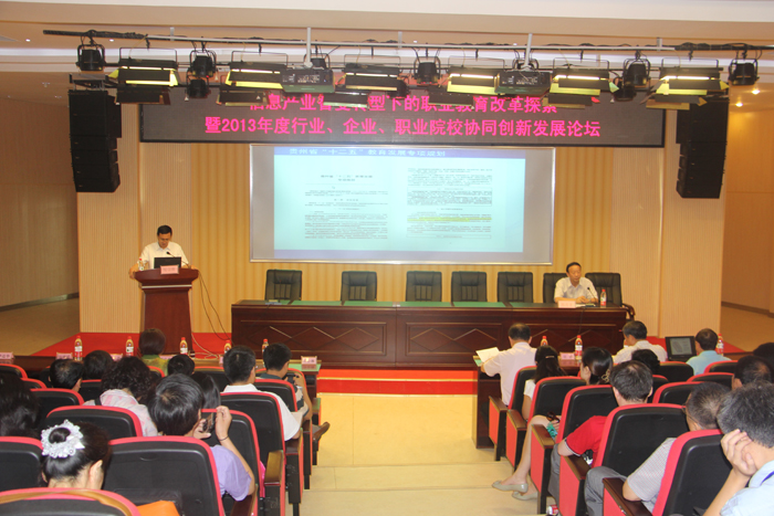 2013年7月24日上午,由教育部职业院校信息化教学指导委员会、全国高等院校计算机基础教育研究会高职高专专业委员会主办,中兴新思教育集团、贵州广播电视大学(贵州职业技术学院)承办,广东岭南职业技术学院、中兴通讯股份有限公司协办的全国信息产业智变转型下的职业教育改革探索暨2013年度行业、企业、高校协同发展论坛第三阶段在我校举行。来自教育部、全国部分职业院校及相关教育委员会的领导及专家,我校校领导及有关部门负责人参加了论坛。论坛由学校党委委员、纪委书记郭万才主持。
