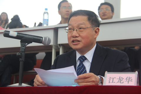 接着,贵州职业技术学院党委副书记、2013级新生军训团政委江龙华作开训动员讲话。江书记在讲话中指出军训能够进一步培养团队精神、集体意识和坚韧顽强、雷厉风行的优秀品质,进一步领悟纪律的含义、规范的意义、生活的真谛,进一步激发爱国热情,增强国防意识。他希望教官们在军训中严格要求、讲究方法、合理安排,以情带兵、科学施训,力争在有限的时间里取得最好的军训效果。希望参训同学一定要以满腔的爱国之情、高昂的报国之志投入到这次军训中;一定要以顽强拼搏、坚忍不拔、吃苦耐劳的毅力和精神,战胜一切可能遇到的困难;一定要服从命令、听从指挥,严格要求,认真训练;一定要站出最标准的军姿,走出最雄壮的步伐,练就最刚强的意志。