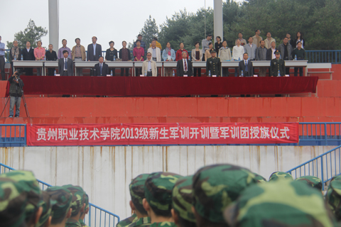 9月4日上午9点30分,贵州职业技术学院2013级新生军训开训暨军训团授旗仪式在运动场隆重举行。贵州职业技术学院党委书记李近华,党委副书记江龙华,党委委员、副院长刘真祥、龚辉以及贵州大学人民武装学院副院长王正奎,体育系副主任陈培林出席仪式。仪式由贵州职业技术学院学生工作处处长于立群主持。