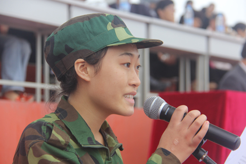 在军训开训仪式上,参加军训的新生代表发言,她代表所有参训同学表示将严格按照学院和教官的要求,一切行动听指挥,严格要求自己,发扬不怕苦、不怕累的精神,顺利完成军训的各项任务,为自己的大学生涯开好头,并带领2013级新生进行了集体宣誓。