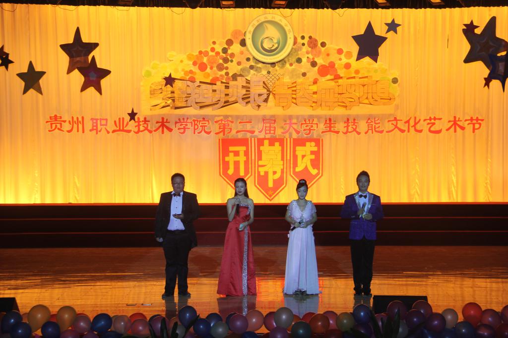 2013年10月14日晚七点,贵州职业技术学院第二届大学生技能文化艺术节开幕式在学院礼堂隆重举行。院党委委员、纪委书记郭万才、党委宣传部部长张仁俊、学生处处长于立群、信息系党总支书记梁正善、院团委副书记陈鹰、各系团总支书记、辅导员老师及学生代表1000余人参加了开幕式。开幕式由院团委副书记陈鹰主持。郭万才书记在开幕式上致辞,首先代表学院党委、行政向2600余名2013级新生表示慰问和欢迎。同时强调大学生技能文化艺术节是我院校园文化建设的重要组成部分;是同学们展现才华、张扬个性的舞台;是为广大同学掌握技能、成才立业的根基。