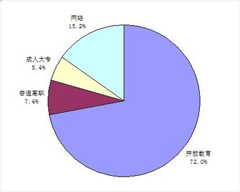 从各类型办学来看,开放教育(含一村一)在校生68317人,同比增加11436人,增幅达20%;网络教育在校生14458人同比增加3103人,增幅达27%;普通高职在校生7023人同比增加1017人,增长17%;成人大专在校生5090人,同比增加947人,增长23%。目前,开放教育占在校生总规模的72%,主体地位进一步巩固;网络教育占在校生总规模的15.2%,高职教育占在校生总规模的7.4%,成人教育占在校生总规模的5.4%。