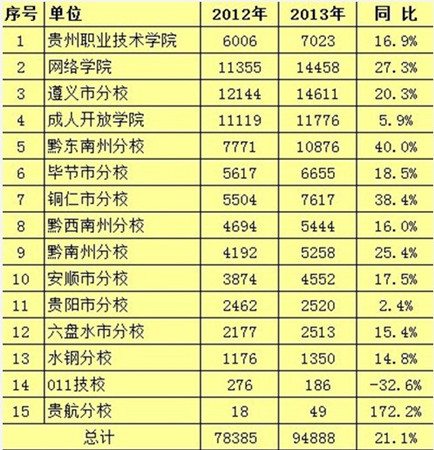 从各分校(学院)来看,在校生规模上万人的分校达到3家,分别是遵义分校、成开院和黔东南分校。增幅排列前两位的黔东南分校和铜仁分校达到或接近40%;网络学院、黔南、遵义增幅在20%以上;毕节分校、安顺分校、贵州职院、黔西南分校、六盘水分校、水钢分校增幅在10%以上;成开院、贵阳分校也有小幅增长。在两所成人分校中,011技校在校生规模与去年相比有较大幅度下滑,贵航分校在校生规模基数较小,未能突破50人。(见下表)