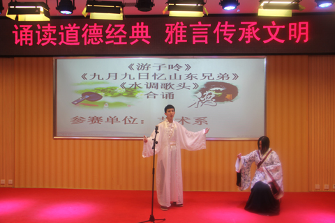 本次大赛是由党委宣传部、图书馆主办,知彩书友会、学生记者团承办,主题为“诵读道德经典,雅言传承文明”。从10月12日开始,各系、中职校就自行组织了预赛,选拔出优秀选手参加大赛。