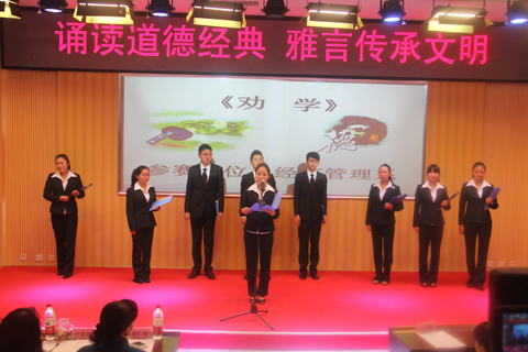为进一步培养学生道德修养,加强学生对社会主义核心价值体系、公民道德素质建设的理解,促进“健康有为、奋发向上”的校园文化氛围的形成,按照全国文明单位创建指标要求,2013年10月28日,我校成功举办了道德经典诵读大赛。党委宣传部、统战部部长张仁俊,图书馆馆长郭云莹,学生处处长于立群,招生就业指导中心主任何滨,公共基础部主任陈国敏,信息技术系党总支书记梁正善,商贸系党总支书记刘德刚,工程技术系党总支书记周吉萍,能源系党总支副书记侯小玲,艺术系党总支副书记卿云,经管系党总支副书记孙燕,中专校副校长王瑾以及公共基础部邹尤老师、艺术系杜鹤鹤老师出席本次大赛。各系、中职校团总支、参赛选手及学生代表100余人参加大赛。