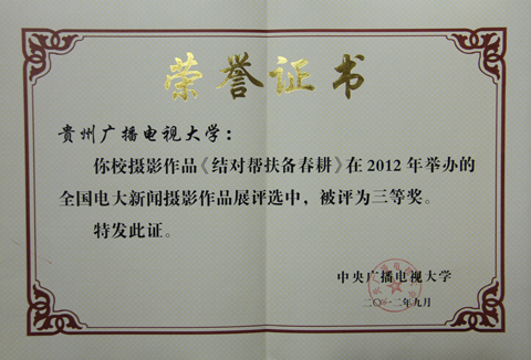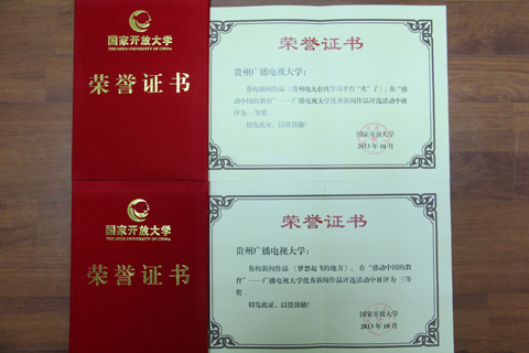 2013年11月19日,从中央广播电视大学(国家开放大学)获悉,贵州电大报送的新闻作品《贵州电大在线学习平台“火”了》、《梦想起飞的地方》分别荣获“感动中国的教育——广播电视大学优秀新闻作品评选活动”一等奖、三等奖。报送的新闻图片《结队帮扶备春耕》荣获全国电大新闻摄影作品展评选三等奖。