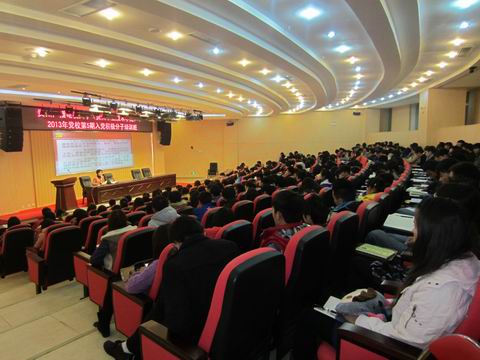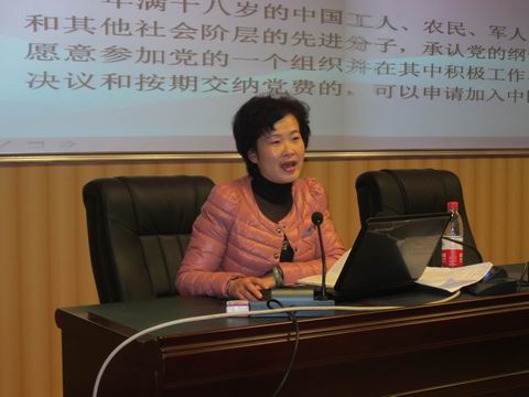 根据学校党校的统一安排,2013年12月10日,由我校工程系党总支书记周吉萍主讲的党校第五期入党积极分子培训第五场专题讲座——“发展党员的程序和手续,争取早日成为合格的共产党员”在学院图书馆学术报告厅举行。