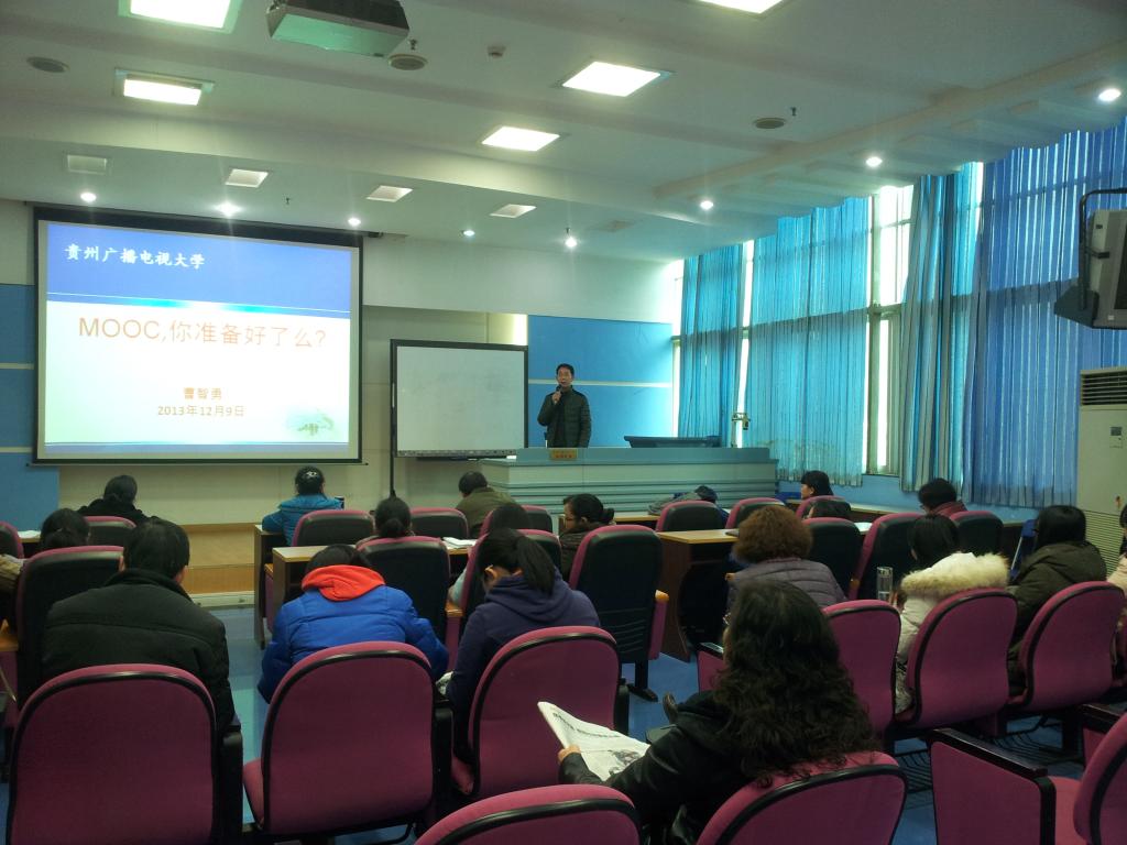 为推动教师专业发展和教学能力提升,促进信息技术与学科教学融合,进一步加强教师队伍建设,打造丰富网上教学资源,贵州广播电视大学教学部陈维副教授、曹智勇副教授分别结合当前教育领域的最新信息,于2013年12月17日上午在四楼学术报告厅作了一场以《微课改变的是什么?》和《MOOC,你准备好了吗?》为题的学术报告。