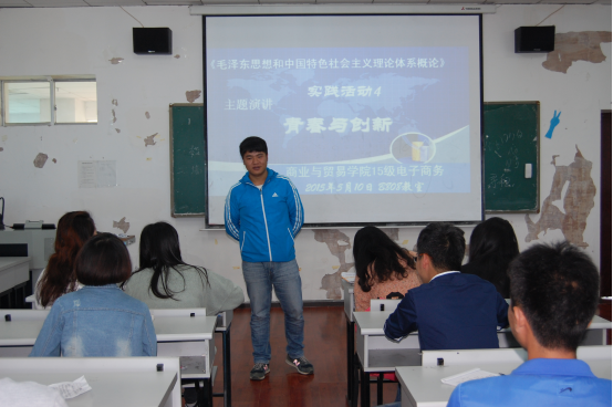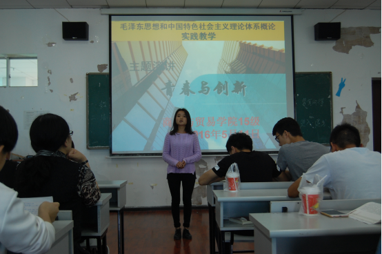 经过任课教师的组织协调,以《毛泽东思想和中国特色社会主义理论体系概论》上课班级为单位的“青春与创新”演讲赛的选拔赛在学院如火如荼地开展。其中商业与贸易学院的法律事务、电子商务专业在陈国敏老师的指导下,于2016年5月4日、10日在B栋教学楼808教室开展了此次演讲赛。演讲赛中抽出十余名同学作为评委,记录同学们演讲的过程,在演讲中选手和观众一起感受青春所带有的巨大创新力量:以创新与青春为主线,以创新与青春为核心,把梦想向着远方高歌。陈国敏老师作总结陈词时,希望当代大学生要不断学习新理念、新方法,积极适应纷繁多变的社会,把思政课的精髓融会贯通,从思想道德修养方面严格要求自己,在读书时刻苦钻研,为将来的创新奠定基础。