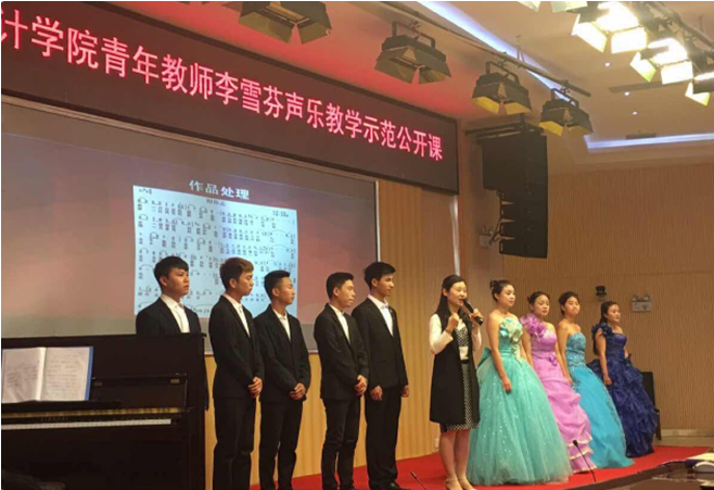李雪芬老师通过此次公开课向大家展示了如何帮助学生调动所有的审美因素,以学生美感的发声与发展贯穿于整个审美过程,进而达到提高审美素质的目的。作品处理环节,由2015级学生景林科同学演唱《跟你走》,李老师进行现场指导、从咬字、呼吸到作品的连贯性等方面,进行了细致的处理,现场气氛热烈、把整个公开课推向了高潮。最后一个环节是学生作品展示:分别由8位同学演唱了《祖国万岁》、《父亲》、《祖国,慈祥的母亲》、《断桥遗梦》及女生四重唱《送你一朵东方茉莉》5首作品。