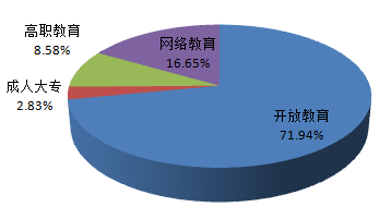 各办学类型中,开放教育(含一村一、助力计划)65109人,占在校生总数的71.94%;网络教育15066人,占在校生总数的16.65%;高职大专7762人,占在校生总数的8.58%;成人大专2563人,占在校生总数的 2.83%。