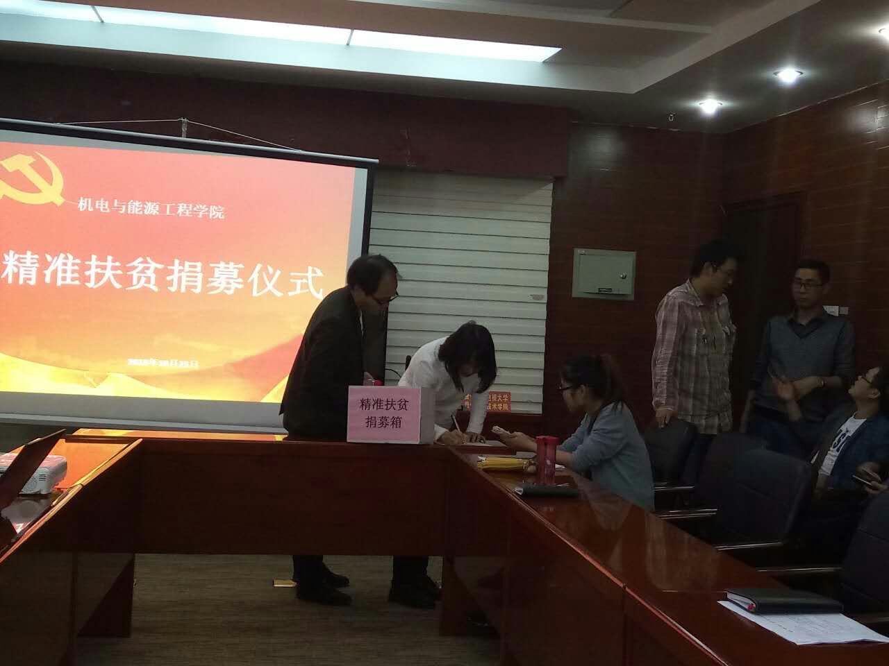 为认真贯彻落实习近平总书记脱贫攻坚的重要指示精神,深入推进教育精准扶贫工作,10月25日,机电与能源工程学院开展精准扶贫工作捐募活动,院领导带头,教职员工纷纷解囊为贫困地区献上爱心,所捐募款项主要用于我院对口帮扶村的困难学生顺利完成学业,在生活上需要帮助的孤寡老人、贫困党员等,此笔捐款将专款专用。