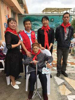 “当老人们听说学校老师要来表演,都高兴得像过节一样。”敬老院负责人介绍。入住敬老院已经两年,今年已是98周岁高龄的邓婆婆作为老人代表,让工作人员为自己戴上鲜艳的红领巾,和大家留下珍贵的合影,虽然语言表达上已经不是很流畅,老人家还是断断续续地说道:“我们能看到这么精彩的节目,感受到欢乐,让我感到晚年太幸福了。”
