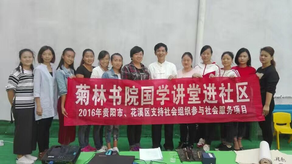 贵阳市花溪区青岩菊林书院“国学进社区”项目。菊林书院是2013年,由贵州大学退休教师饶昌东无私奉献提供私宅创办的,以社区老年人为主的一支志愿者社会组织。坚持“国学传承•人文精神暖民心”,奉献不思量,志在传承国学,宣扬传统文化的队伍,自发学习诗词,传承诗词,学习书画歌舞。菊林书院组成的志愿者服务队,到基层、到农村、特别到偏远的贫困地方,以诗书画、歌舞宣传党的群众路线精神,把人文精神送到小区大院里、农村群众家门口、场坝里。为这些农村,学校,街头义务写绘的文化墙近几十公里。这些文化墙大多描绘祖国大好河山,经典诗作,宣扬社会主义核心价值观,宣传党的各项中心思想与政策,写遍了花溪区,写遍了青岩镇,甚至还写到惠水、剑河等县,深受老百姓赞誉。不仅如此,志愿者们还每年坚持义务下乡为老百姓写春联;带头开展老人学电脑,手机,用短信,微信,宣传正能量;并义务培训中小学生,留守儿童.成功举办多次书画展,已出版多集册诗书画集。在花溪区党委政府的领导下,努力把青岩历史文化古镇创建为贵州省首个“中华诗词之乡”。全国70多家媒体给予报导文上百篇。曾多次受到全国、省、市、区表彰,仅近三年就被授予了贵阳市先进基层党支部、贵阳市优秀社会组织、贵阳市优秀志愿服务组织荣誉称号。