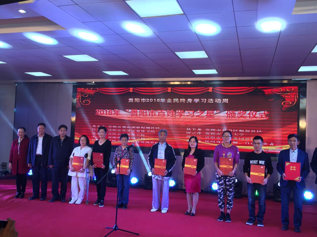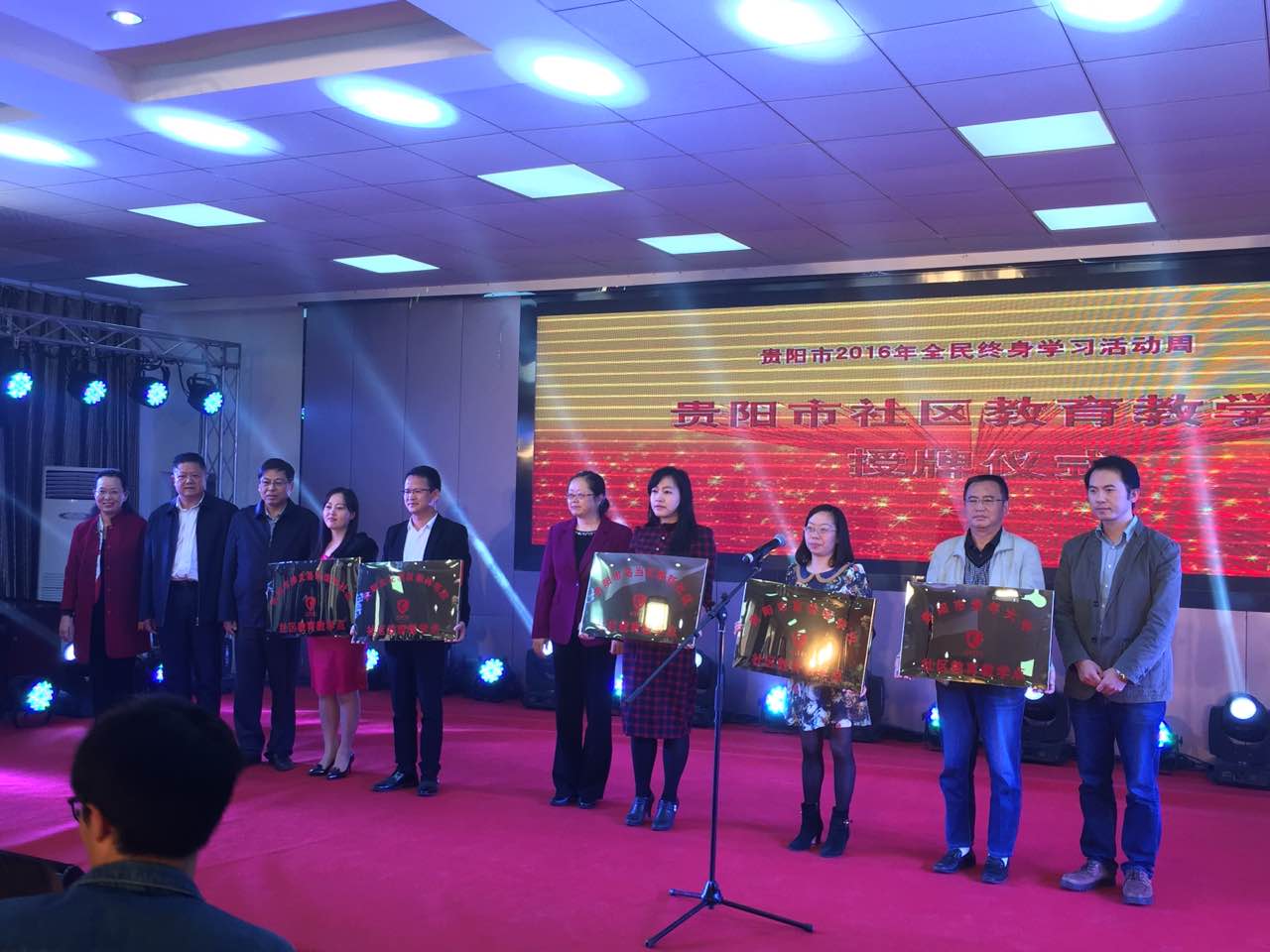 开幕式的第二个环节,相关领导为贵阳市老年大学、贵阳市盲聋哑学校、乌当区顺新社区、花溪区菊林书院、修文县珍珠河社区授牌,正式将这5家单位纳入贵阳市现代社区教育第二批教育教学点。龙步才、饶昌东、张天珍、胡映晞等9位市民被评为2016年“贵阳市百姓学习之星”;贵阳市观山湖区明珠老年学校、花溪区菊林书院2家单位被评为2016年“贵阳市终身学习品牌项目”。
