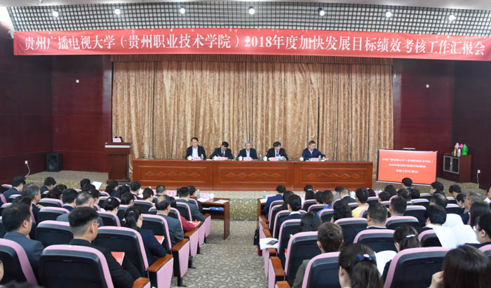 李皖校长代表学校做2018年度加快发展目标绩效考核工作报告:一是高度重视、压实责任,目标考核深入开展;二是强化党建引领、突出“四个坚持”,开创发展新局面;三是全面深化改革、“三做”推动发展,取得发展新成绩;四是服务脱贫攻坚、做实思政教育,呈现发展新亮点。李皖校长表示,希望各位领导和专家多提宝贵意见,帮助我们找准问题、厘清思路、明确方向、科学实施。2019年,学校将在全面总结过去工作经验和不足的基础上,抢抓机遇、深化改革、开拓创新,全面推进学校各项工作,以更大的决心、更大的力度、更大的勇气实现学校核心竞争力的提升,为全省决战脱贫攻坚、决胜同步小康作出新的贡献。