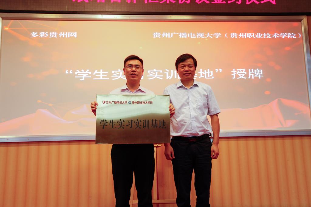贵州广播电视大学(贵州职业技术学院)党委书记王爱华为学生实习实训基地授牌,多彩贵州网党委副书记邓航接牌。