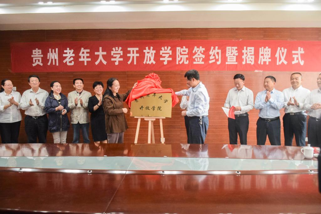 贵州广播电视大学(贵州职业技术学院)党委书记王爱华与贵州老年大学党委书记、校长郭焱共同为贵州老年大学开放学院揭牌。